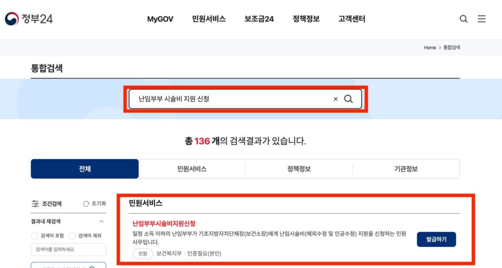 온라인 첫번째 방법은 정부24 누리집 사이트(https://www.gov.kr/)에서 ‘난임부부 시술비 지원 신청’을 검색하셔서 신청합니다.
