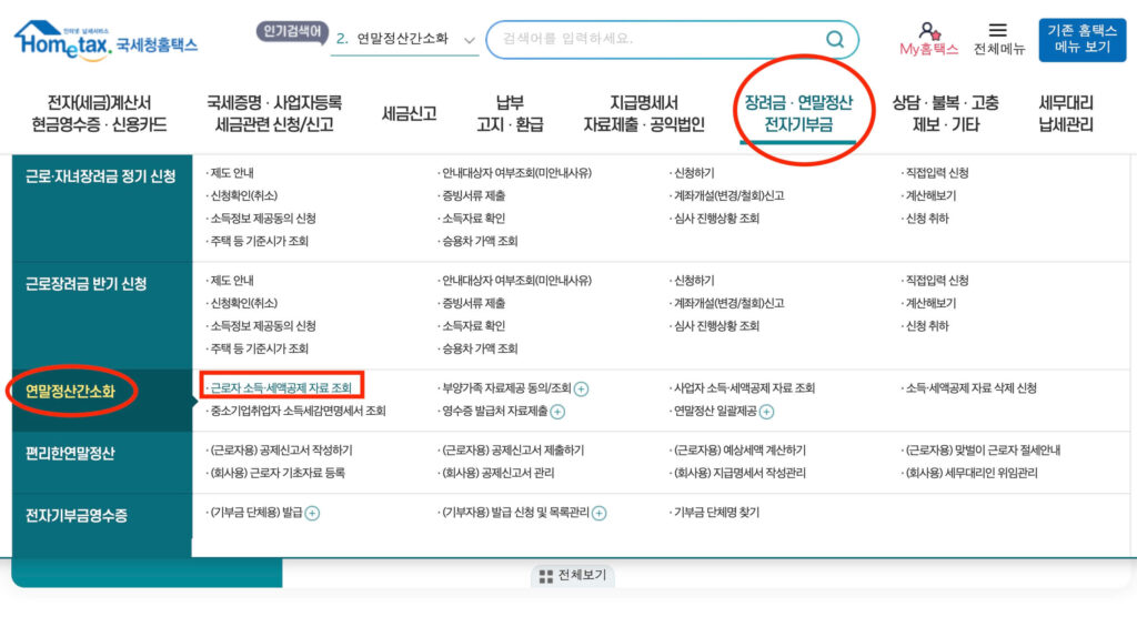 • [장려금,연말정산,전자기부금] 카테고리 선택 후 [연말정산간소화]->[근로자소득,세액공제 자료조회] 클릭합니다.