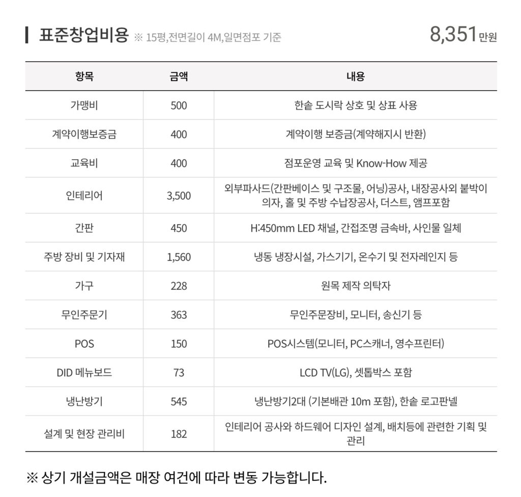 15평기준의 매장으로 발생되는 금액입니다. 가맹비 500만원, 계약이행보증금 400만원, 교육비 400만원, 인테리어 3500만원, 간판 450만원, 주방장비 및 기자재 1560만원, 가구 228만원, 무인주문기 363만원, POS 150만원, DID 메뉴보드 73만원, 냉난방기 545만원, 설계 및 현장 관리비 182만원 등 총 금액이 8,351만원이 예상됩니다. 해당 금액은 보증금을 제외한 비용들은 부가세 별도의 금액입니다. 물론 현장 상황 및 환경에 따라 추가 비용이 발생 할 수 있고 위에서 언급한 내용을 제외하고 부동산 계약관련 임대료, 보증금, 권리금은 제외된 금액이라는 점 참고하시기 바랍니다.